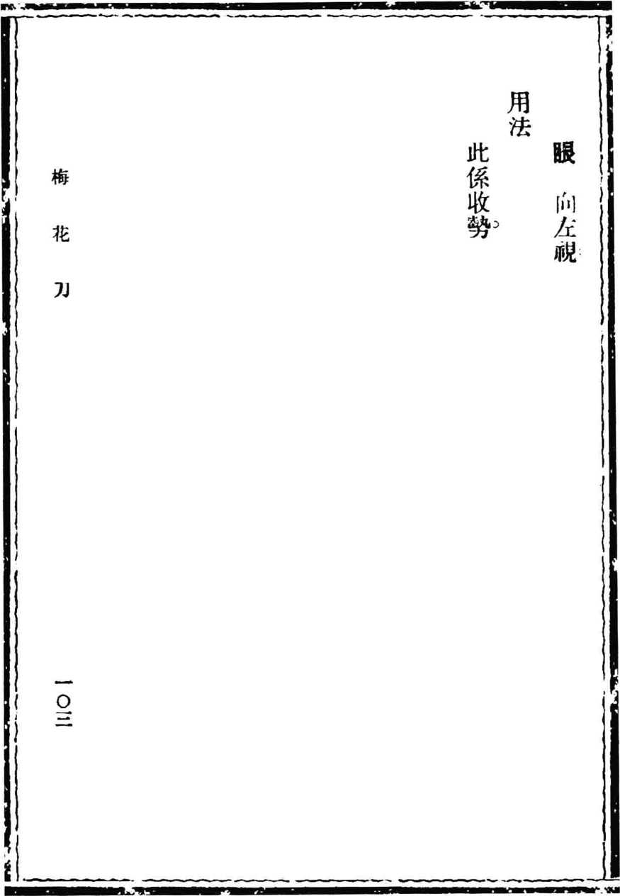 梅花刀 一 〇 一身Ini右斷 歩左腿原地伸?右足移動與左.足靠櫳並衝0 手右手將刀由左脇従趣順左肩媒齙沿右肩向右方下縳至於循左腿向上昏刀尖向±°刀刃InJ於刀背貼*脇後上跑手執刀柄在左脇下0面 。左手抱於胸鼢在右手|:°手心朝扑大指貼右嶎 眼rnlwii用法0。如^我頭部劈於我卽將刀向上架i隨向其內底腕撩’