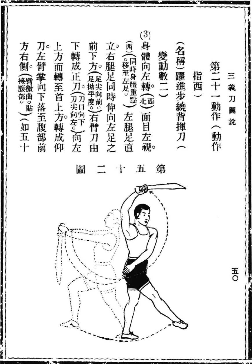 二圖)(2)身體半面向左斯<炙|1時右腿足僅體尚前第 落To左腿足急速躍向右 足前線一步弓_ (lif成前nr\ /花右足將落地時。身 後箭〇 j V體?點及左足0務靈卜il3同時右臂刀轉成, 垂办由左繞體背向旮經三 右平方揮向前平步轉成 平办(ISIIS同時左臂圖 掌向左旋餘經左平方向 >而至首上龙成反梦(三義刀鼷說五