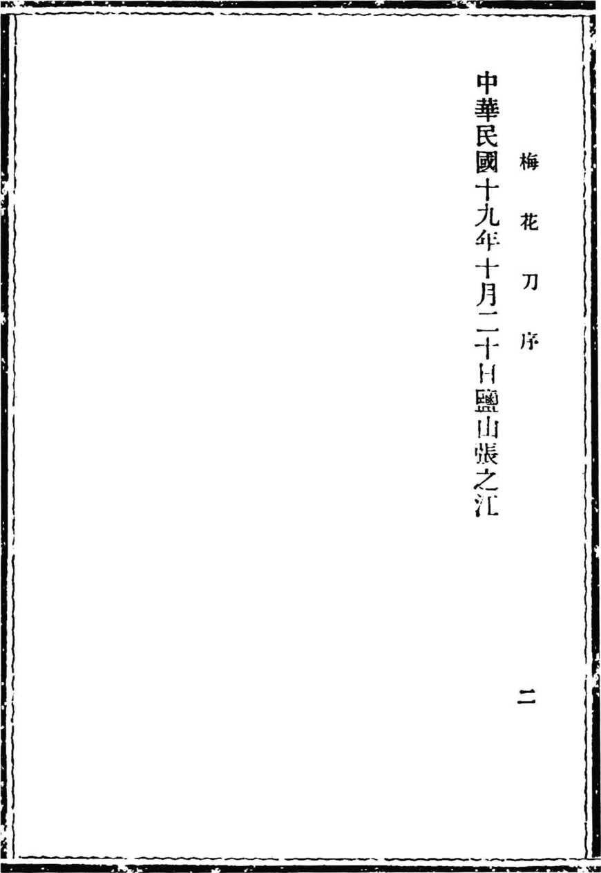 余主中央国术馆于兹两易寒暑矣,每以为欲使前述 之所苦所病得一解决之途径,唯以用归纳的方法,从改 革与创造着手,方为根本之图;否则提倡虽力,其奈收 效之终鲜何?虽然改革与创造,岂一朝一夕之所易言哉。 盖创造之先必经实验,实验之先必经整理,故整理国术 实为改革创造之初步。余尝以斯意示诸同人,嘱其多从 整理下工夫,整理愈多,则研究之资料愈富,至其本身 价值如何,编者仅管存而勿论,一听后来之实验,定其 去取可耳。吕同志光华、李同志元智编《梅花刀》成, 敢以一得之见弁诸简首3