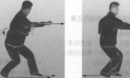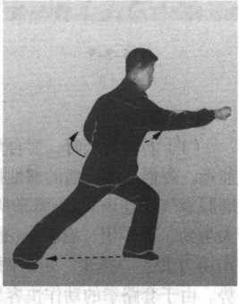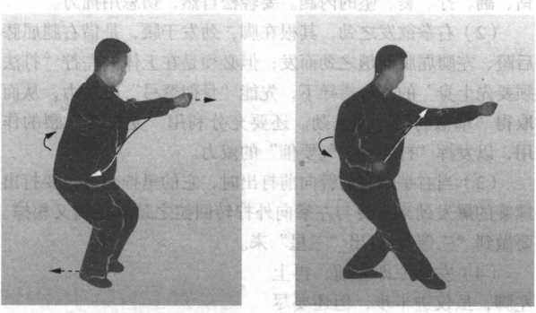 (3)既是后退又是拗步出拳,故必须两腿弯曲,相靠夹 紧,以求步稳桩实,使周身完整一气,出拳乃能迅猛刚实。