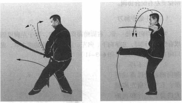 倒步要快,与横拍齐到要借腰力;左手、左脚前出和右刀