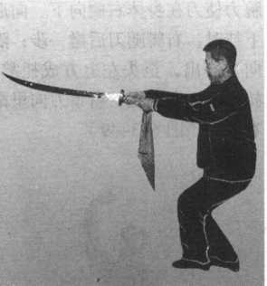 2. 图 6-3-45图 6-3-45动作不停。左脚 向前趟进一大步,右脚 随即跟进成崩拳步;同 时,双手持刀,借腰力 向前崩出,刀身平,高 与胸齐;目视刀前方。 (图 6-3-47)