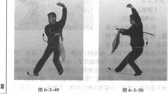 2. 动作不停。身往 右转,右脚向右外前方 摆步,重心仍在左脚 (图6-3-50 )0两手动作 不变;身体继向右转, 左脚向右脚前做环行扣 步,两脚成内八字;目 视右方。(图已3-51)