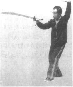 3. 上动不停。重心左移,右脚撤至左踝里侧,双腿直立 并步立正;左手抱刀下落于身左侧胯旁;同时,右手变掌,里 旋前臂,下摆臂经身前至头右侧上方抖腕亮掌,四指尖向左; 眼睛随右掌转动,最后目视左肩前方。(图2-4-19)