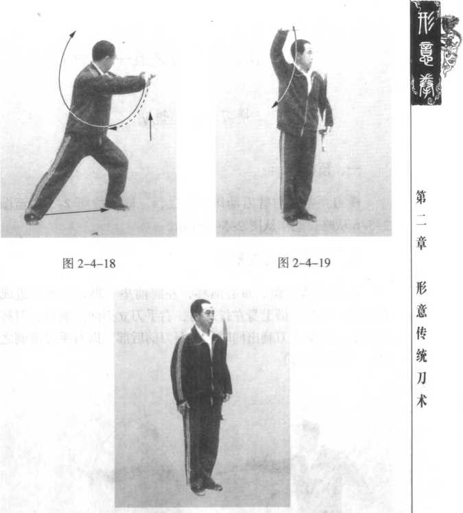 1. 图 2-4-15图 2-4-15图 2-4-16图 2-4-16第章形 意 传 统n 术第章形 意 传 统n 术左脚前垫一脚,成左三体式桩步;右手刀边里旋腕边 弧线向左摆刀,使刀身平,高与胸齐,刀刃朝外;左掌下落按 扶刀背上,左掌四指尖向上;目视刀前方。(图2-4-16)