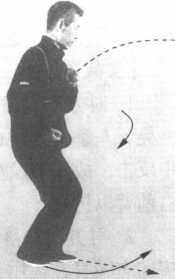 3. 对方就势向我左方一转身,不仅躲开我右劈拳,且转 到我身后,抡起左臂向我面门打来。我扣右脚回身,右臂由头
