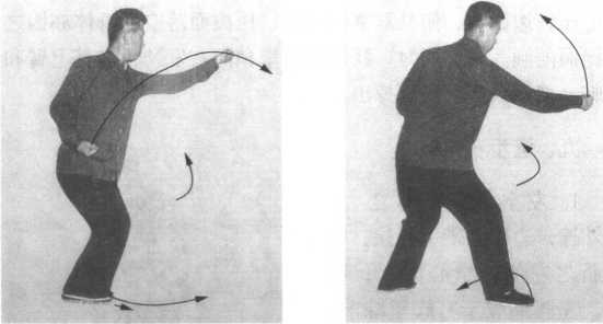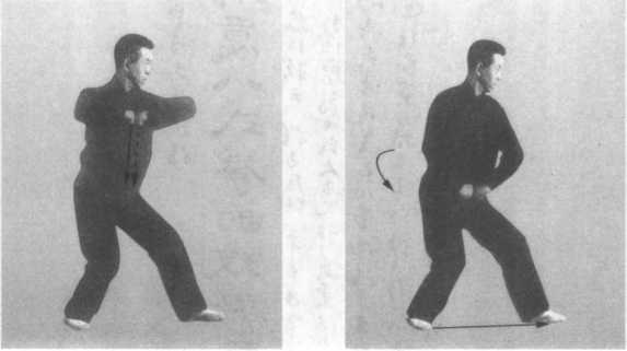 2. 提步钻左拳,要使出左拳与落左脚、提右脚上下合一。 拧腰纵力,不可左斜右歪。