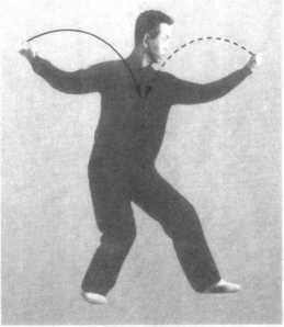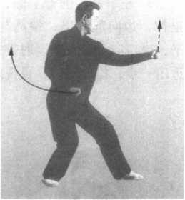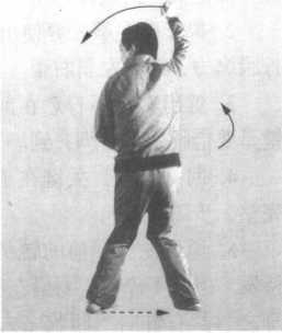 1 .借左转身之力,右拳经身右侧向上,经头上绕至头前,