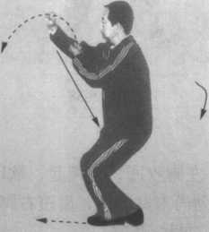 虎口向下;同时,右膝及右脚 尖里扣,两脚成内八字形;重 心微前移;目视左肩前方。 (图 1-2-35)