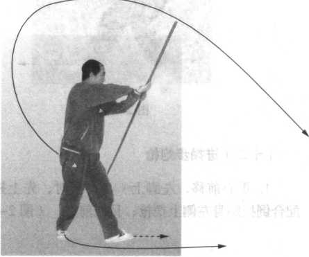 1.左脚外摆脚尖向前落步;同时,两手边先右后左向 上捋把至枪身中节,边贴身左侧立圆挂摆枪;目视前方。 (图 2-6-21 )