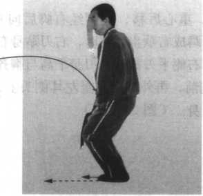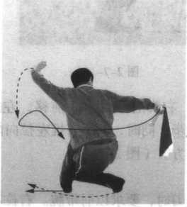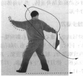 (2) 双手同时持刀缠头时,要求两臂尽量抻直上举,使刀 背贴后背,而且要劲力流畅,与两脚落地协调一致。