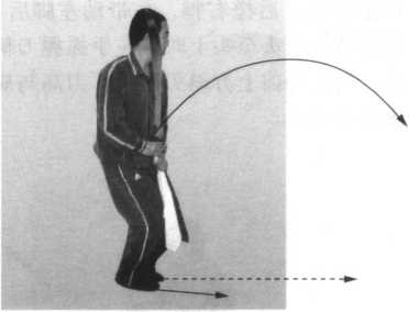 1.重心前移,右脚前趟一大步,左脚跟进成左提步;同 时,双手右拉左推,使刀身直立回拉至右肩前,刀刃向前;目 视前方。(图2-7-32 )