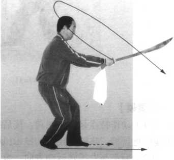 进步横刀要借前趟后蹬腿力及裹脑刀的惯性,力达刀身 中部。