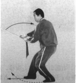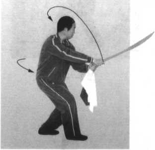 原地左摇转180。接退步劈刀,反映形意器械进退都能攻 的特点。