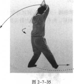 1. 借左转身,右脚尖里扣成内八字步;同时,双手持刀 缠头到身背后。(图2-7-35 )