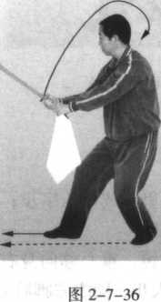 2. 动作不停。借身左转,重心移向身右侧,左脚经右脚 后向前进相反方向搓退一大步,随之右脚后退成右三体式;同 时,双手持刀完成缠头后,向退步后的右脚前上方斜刃劈刀, 刀高与肩平;目视刀前方。(图2-7-36 )