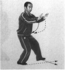 1.脚不动;借右拧腰, 双臂右平摆90。(图1-2-14)。 接着左脚向前进方向右45。挤 趟垫上一步,右脚跟进提起成 右提步;同时,双掌边变拳边 回拉至脐之左右,拳心向上; 目视前方。(图1-2-15 )