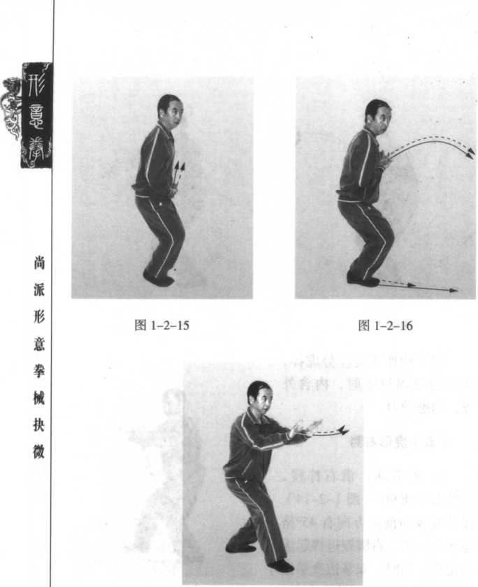 抵(图1-2-16)o接着,借左脚后蹬,重心前移腰右拧,向前进 方向右45。趟进一步,随之左脚跟进成右三体式步;同时,两掌 边里旋边向上、向前弧线下劈掌。定势后两肘高与胸齐,两掌指 尖向前,力达两前臂及两掌下方;目视两掌前方。(图1-2-17)