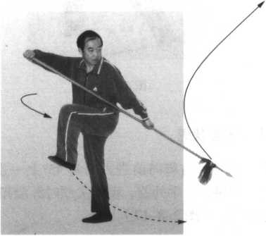 3. 动作不停。右脚前上一步,随之左脚勾脚尖前提膝; 同时,左手活把,右把回拉前推,使枪尖在同高度下向左横拨