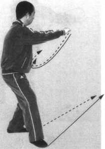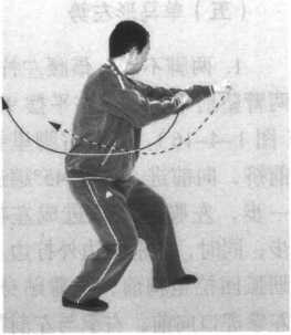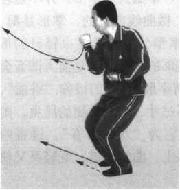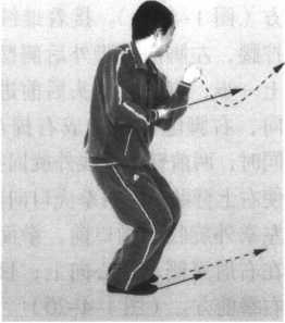 步;同时,两前臂里旋,右拳边下扣腕边右拨挂,边向前冲 击;左拳随之跟进至右肘里侧,两拳面向前,拳高与胸平;目