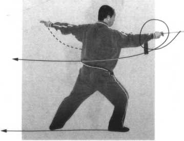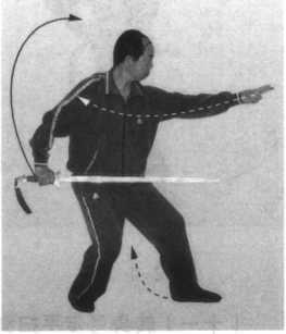 借右转身平扫剑,形意门也叫横崩剑,要求右手剑、左脚 同动停,力达剑上刃。