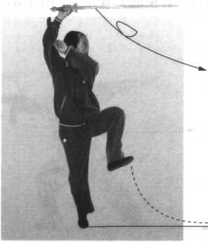 右摆架剑与左提膝要上下相合,上身直立,独立步要稳。