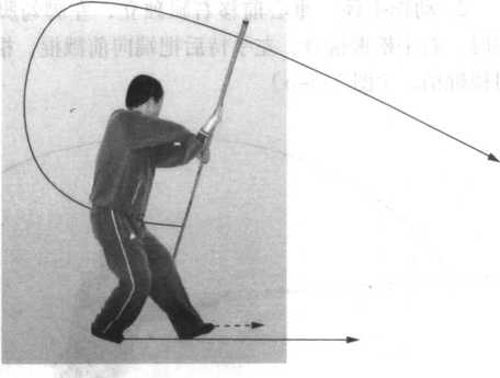 (1) 左转身左摆脚与两手配合贴身左侧立圆挂棍要协调。