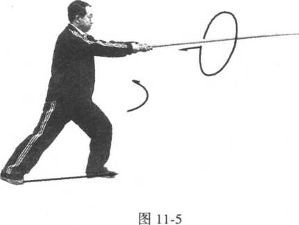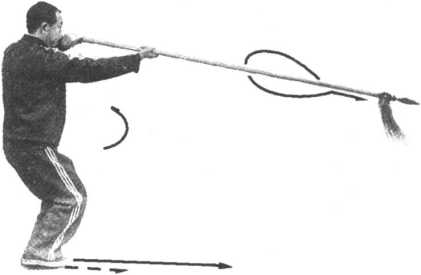 3. 上动不停,右脚前趟一大步,左脚 随之跟进半步或右三体式;同时左手持枪 后把边外旋小臂,手心向右,使枪逆时针划 一圆,向前推刺枪,枪尖与肩高,右臂微屈 尽量伸出,左手持后把置右肘窝旁;目视枪 前方(图ll-7)o