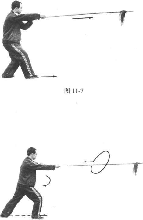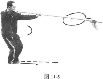 1. 右脚借重心前移,垫上一步成右弓 步;同时左手持后把向前刺枪,枪身平,高 与肩平;目视枪前方(图ll-8)o