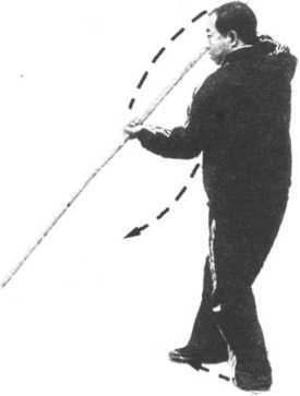 1. 随身体左转,右脚尖里扣,向左腿外 扣步,重心仍落左腿;左手向前捋把,使棍梢 掩着右脚尖随身体转动;目视左前方(图 24-10)o