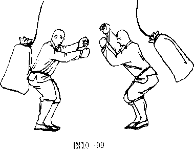 1. 悬吊沙袋一个,内装黄沙,重量适中,以臀部撞击沙 袋,使其能摆起一定角度(图10—99),每日早、中、晚练 习三次,每次撞击100下左右,坚持练习,逐日增加次数, 直至每天能撞击1000下左右?