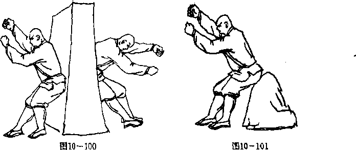 2?以臀部撞击砖墙或石块(图10 —100),每天早、中, 晚练习三次,每次撞击1000下左右,坚持练习,逐渐增加次 数,直至每天能撞击1000下左右?