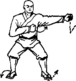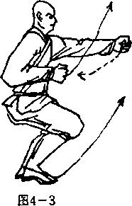 两脚原地不动,左拳向前方 冲击,拳髙与肩平,拳心向右, 拳眼向上;右臂屈肘右拳收护于 胸前右侧,拳心向左,拳眼向 上?目视前方(图4—3)。