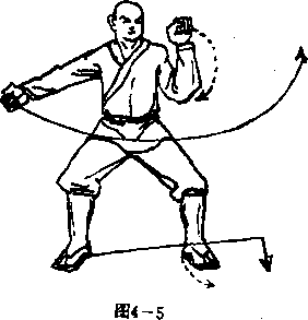 拳心向前,拳眼向上;左臂 屈肘左拳挑于左前侧方,拳 心向前,拳眼向右。目视左 拳(图4—5 ).