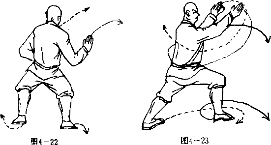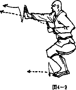 实战应用:此势多用于崩击侧面或后追之敌。如敌从后 面赶来,我用反掌崩击敌档部、小等处,是转身击敌之 法.