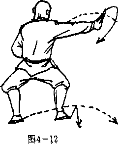 外侧,左脚抬起,右脚为 轴,体继续左转180°,左 脚落于右脚内侧一步,两 腿成马步,同时,两拳变 掌,右掌随势向右侧推击, 掌心向右,掌指向上,左 臂屈肘左掌收护于胸前, 掌心向右,掌指向上,目 视右前侧(图4一12)。