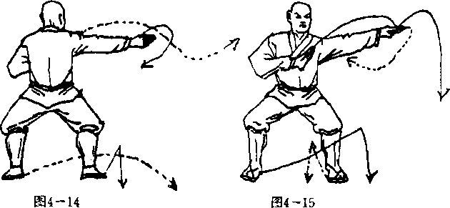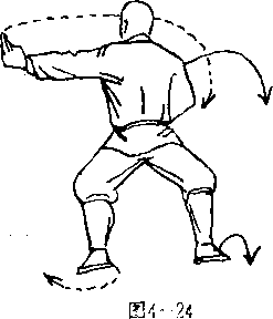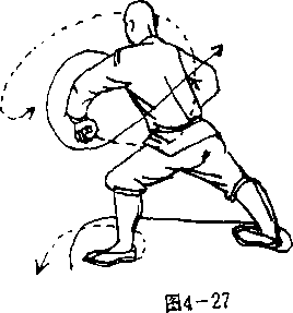 抬右脚原地震脚下 落,左脚抬起,右脚为轴 体右转180°,左脚横跨于 右脚内侧一步落地,两腿 成马步;同时,右臂屈肘 右掌旋腕缠拧收护于胸 图4一13 前,掌心向左,掌指斜向