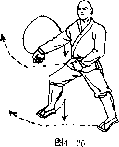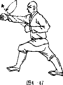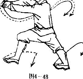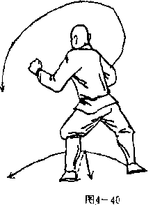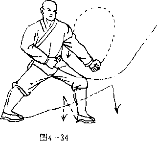 杯弧,向右下侧砸击,拳心斜向前,拳眼向外,左臂屈肘栌 于腰间左侧。拳心向内,拳眼斜向右。目视右前侧(图4一41)。