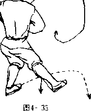 左脚不动,右脚抬起向 前弹踢,两腿成独立步> 同 时,右拳向前上方挑撩,拳 心向左,拳眼斜向上;左臂 屈肘收护于腰间前侧,拳心 向右,拳眼斜向上。目视前 方(图4—4)。