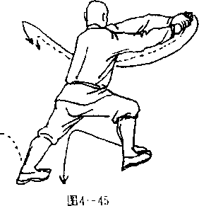 掌心斜向下,掌指斜向右目 视左前侧(图4一45)。