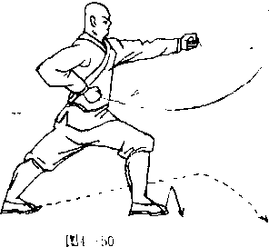 右脚在前方一步下落,两 腿成右弓步;同时,两掌变 拳,右臂屈肘右拳护于右肋外 侧,拳心向左,拳眼向上;左 拳向前冲击,拳心向右,拳眼 向上。目视前方(图4—50)。
