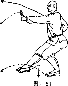 使两腿变成右横弓步;同时 右掌随势反崩于右下侧,掌心 斜向内> 掌指向下,左勾手变 掌,架于头上左侧,掌心斜向 上,掌指斜向右。目视右掌 (图4 52 ) ? 图452