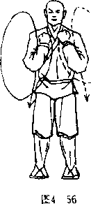 两脚踞地,体右转90°, 两脚八宇步站立,上体正直: 同时两臂屈肘、两掌变拳向胸 前搂击,两拳心向内,拳眼斜 向上。目视前方(图4一56).