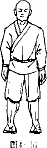 图41两脚八宇步站立,上体正直,两臂 自然下垂,五指并拢,紧贴两大腿外 侧,掌心向内,掌指向下? 视前方 图4一1) 〇