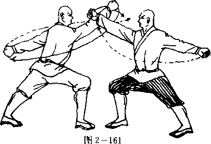 甲右脚在前方一步落地,两腿成右弓步;同时右掌变 拳,由后向前砸击乙方头部,拳心向左,拳眼斜向上左掌变拳展于身后,拳心向左,拳眼斜向上。目视乙方。乙两掌变拳,右拳囟上架拨甲方右拳,拳心向左,拳眼 斜向上;左拳摆于身后左侧,拳眼斜向上。目视甲方(图2 — 161 )。实战应用:甲方砸捶,用于攻击乙方上盘;乙的架捶是防守之招法。