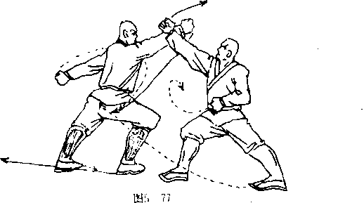 乙右脚在前方一步下落,两腿成右弓步:同时右拳由后 向前劈砸甲头部,拳心斜向左,拳眼斜向上;左臂屈肘左拳 收护于腰间,拳心向内,拳眼斜向前。目视右拳。甲右弓步不变;右拳在前向上架拨乙方右腕,拳心向 左,拳眼上;左拳于左后侧,拳心向左,拳眼向上。目 视右拳(图5—77)。