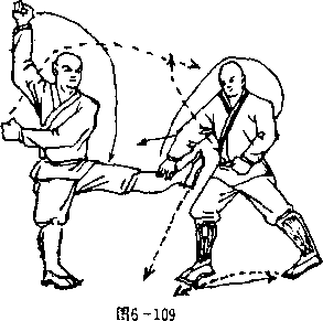 甲右脚内收,两腿成右弓 步;同时,右掌向下拍击乙左 腿,掌心向下,掌指斜向左: 左臂屈肘左掌变拳,收护于腰 间前侧,拳心向内,拳眼向 前,目视乙腿(图6—109 )。