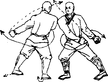 乙起身,两脚向前移步,两腿成右弓步;同时,左拳甩 于体后左侧,拳心向左,拳眼斜向后右臂屈肘右拳护于腰下 左侧,拳心向内,拳眼斜向上上体右倾,以右肩抗击甲目 视甲头部.甲两脚前后换步,两腿成右弓步,同时两拳甩于体左后 侧,左拳心向内,拳眼斜向左;右拳护于左腰下侧,拳心向内,拳眼向上.上体右倾,以右肩抗击乙.目视乙头部 (图 6 — 124)挪
