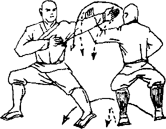 乙两脚抬起向左旋跳180°,落地后两腿成右弓步;同时 两拳变掌,右臂屈肘右掌护左肋前侧,掌心斜向内,掌指向 左:左掌向甲头部横打扳击,掌心向前掌指向左。目视甲 方。屮阏腿不变;俩拳变掌,左击向上反拨乙方来掌,掌心 向前,掌指向上;右臂屈肘右掌护腰前侧,掌心向内,掌指 斜叫左。目视乙方(阳7—103),图 7 —103