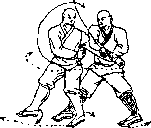 甲抬左脚原地震脚下落体左转90右脚前上一步,两 腿成叉步,绊住乙方左腿;同时,双手抓住乙方左臂,按拉 于身前。目视乙方。乙两腿变成右虚步;左臂被擒:右臂屈肘右掌护于左肋 外侧,掌心向内,掌指向后。目视甲方(图7—104)。图7 — 104